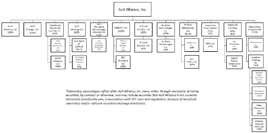 Our direct and indirect wholly owned subsidiaries include (i) Ault Lending, LLC (“Ault Lending,” formerly known as Digital Power Lending, LLC), (ii) Ault Global Real Estate Equities, Inc. (“AGREE”), which wholly owns AGREE Madison, LLC (“AGREE Madison”) and Third Avenue Apartments LLC (“Third Avenue Apartments”), (iii) Ault Disruptive Technologies Company, LLC (“ADTC”), (iv) BitNile, Inc. (“BNI”), which wholly owns Alliance Cloud Services, LLC (“ACS”) and BNI Montana, LLC (“BNI Montana”), (v) Circle 8 Holdco LLC, a Delaware limited liability company (“Circle 8 Holdco”), (vi) Ault Energy, LLC (“Ault Energy”), and (vii) Ault Aviation, LLC (“Ault Aviation”). We also have a direct controlling interest in (i) Imperalis Holding Corp. (“IMHC” or “TurnOnGreen”), which wholly owns TOG Technologies, Inc. (“TOG Technologies”) and Digital Power Corporation (“Digital Power”), (ii) Giga-tronics Incorporated (“GIGA”), which wholly owns Gresham Worldwide, Inc. (“GWW”), which in turn wholly owns Gresham Power Electronics Ltd. (“Gresham Power”), Enertec Systems 2001 Ltd. (“Enertec”), Relec Electronics Ltd. (“Relec”) and has a controlling interest in Microphase Corporation (“Microphase”) and (iii) Avalanche International Corp. (“Avalanche” or “AVLP”). Ault Lending has a controlling interest in The Singing Machine Company, Inc. (“SMC”), Circle 8 Holdco has a controlling interest in Circle 8 Newco LLC (“Circle 8”), and ADTC is the sponsor of Ault Disruptive Technologies Corporation (“Ault Disruptive”).